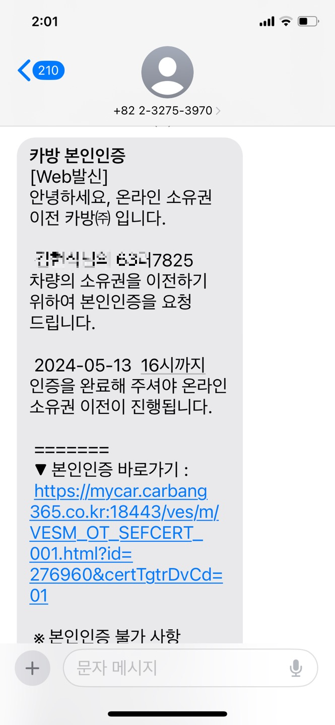 2.차량 번호 입력 개인 인증 문자로 메세지 전송(소유이전 동의 절차)