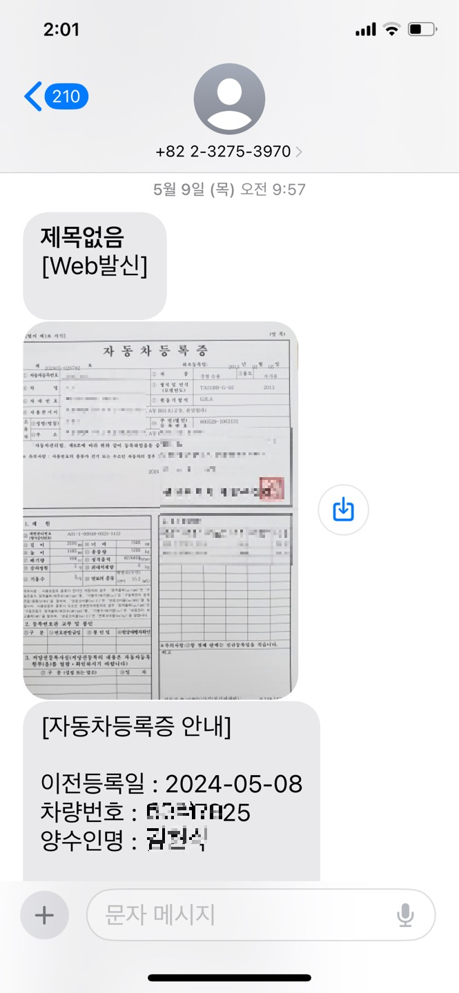 3.익일 오전 차량 이전이 완료 되어 차동차 등록증 문자 수신됨