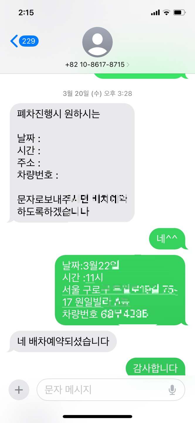 4) 3월 20일 폐자장에서 차량회수 일정조율 문자 받음 탁송배송 배차 예약 잡힘