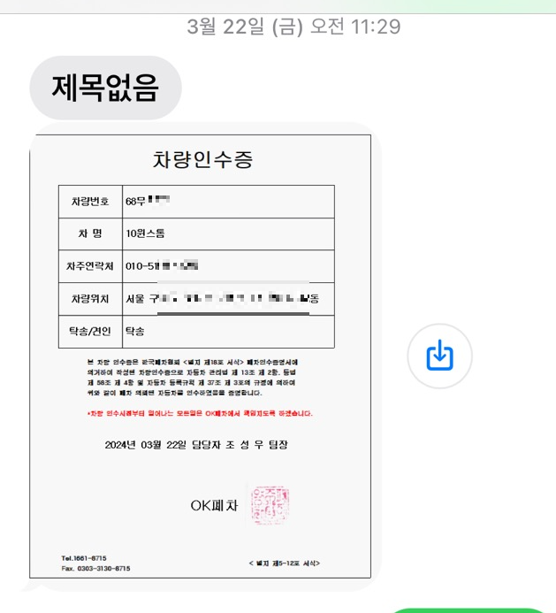 5) 3월 22일 탁송기사님 집으로 방문 차량 인계 차량 인수증 폐차장으로부터 받음(문자)