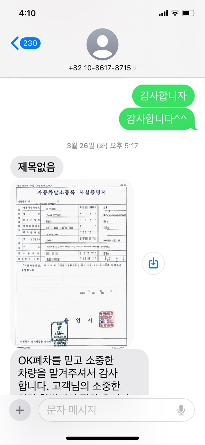 차량폐차 후 말소증 전송받음