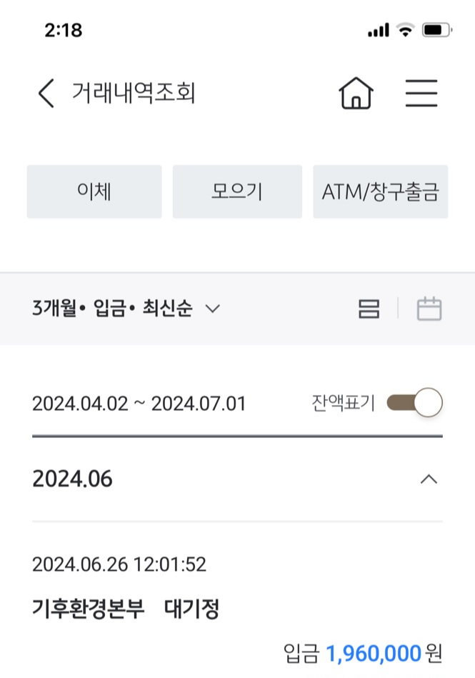 11) 6월 26일 추가 보조금 196만 원 입금 받음(기후환경본부)