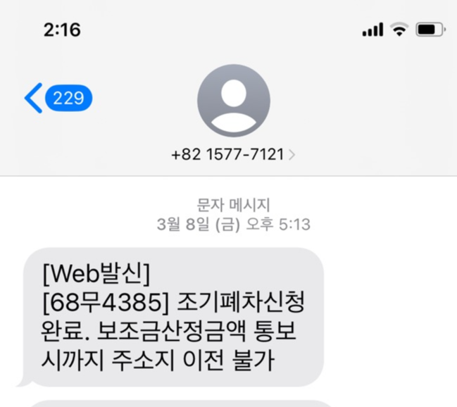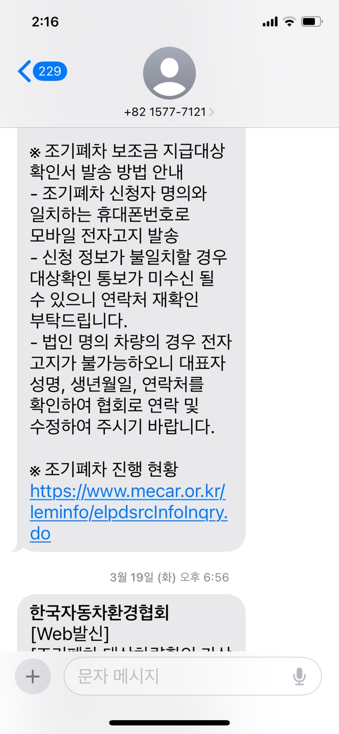 한국자동차환경협회로부터 조기폐차신청완료 문자 받음