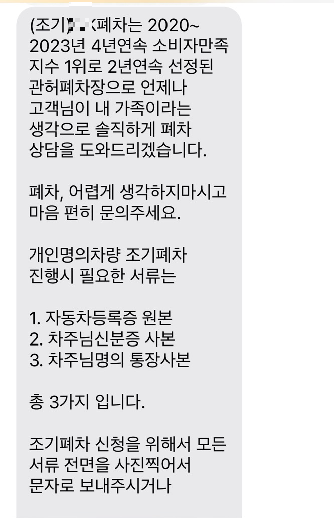 수원 O땡 폐차장에 조기 폐차 문의 하였고 위와 같은 답변을 받게 되었습니다